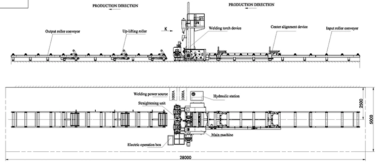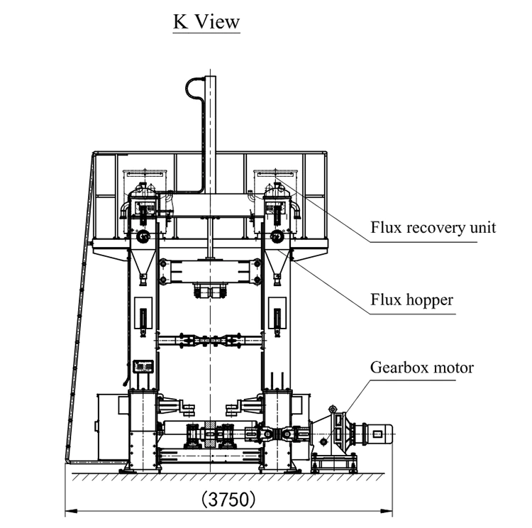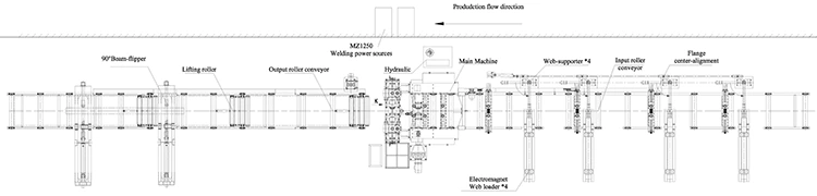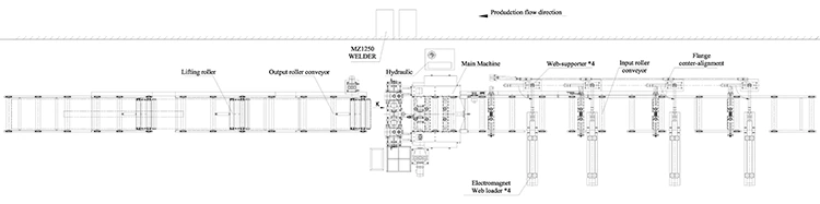 मानक झेडजे 3-इन 1 एच बीम वेल्डिंग लाइनमध्ये एक इनपुट रोलर टेबल, मुख्य वेल्डिंग आणि स्ट्रेटनिंग स्टेशन, आउटपुट्रोलर टेबल आहे. मुख्य वेल्डिंग आणि स्ट्रेटनिंग स्टेशन येथे फ्लक्स रिकव्हरी युनिटसह, वेल्डिंग हेड आणि फ्लॅंज आणि वेबसाठी क्लॅम्पिंग डिव्हाइस. वेल्डिंग पॉवर सोर्स, हायड्रॉलिक स्टेशन आणि कंट्रोलोप्रेशन देखील समाविष्ट आहे.